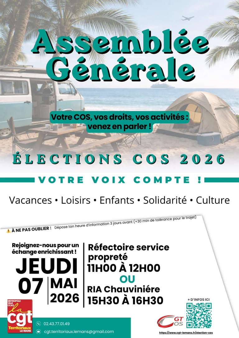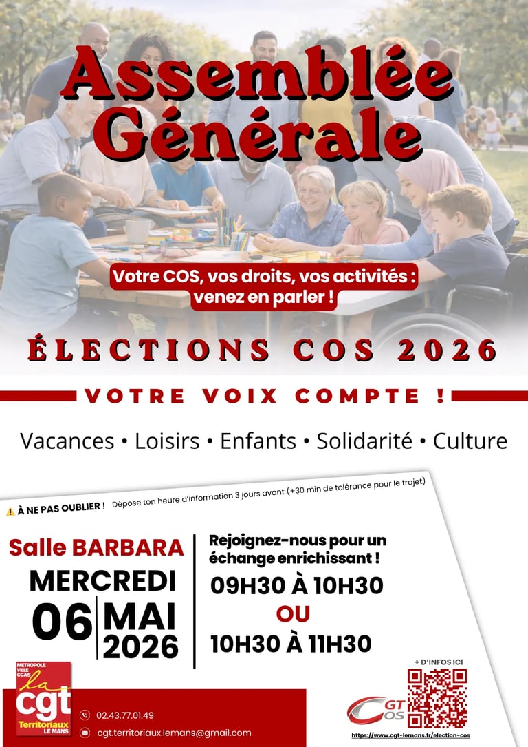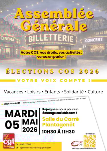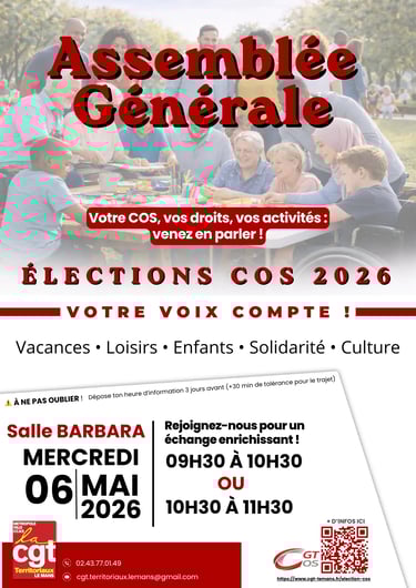 Dans le cadre des élections du COS 2026, la CGT organise plusieurs assemblées générales près de vous.
