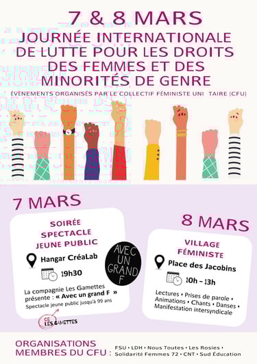 Dans le cadre de la Journée internationale de lutte pour les droits des femmes et des minorités de genre, le Collectif Féministe Unitaire (CFU) organise plusieurs temps de mobilisation au Mans.
